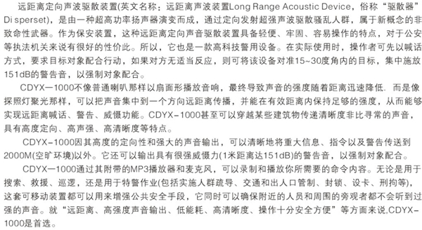 與傳統(tǒng)的擴音系統(tǒng)比較,遠距離定向聲波發(fā)射裝置是一種革命性的新技術(shù)。它具有非常的遠射功力,可以將聲音信息清晰地傳遞到數(shù)百米以外,甚至能穿越某些建筑物;它具有強大的震懾威力,可以逼迫受眾自動離開禁入?yún)^(qū)域;它具有精準的定向能力,可以瞄準一定角度發(fā)射難以承受的刺激性聲波,而在其它角度卻無不適。